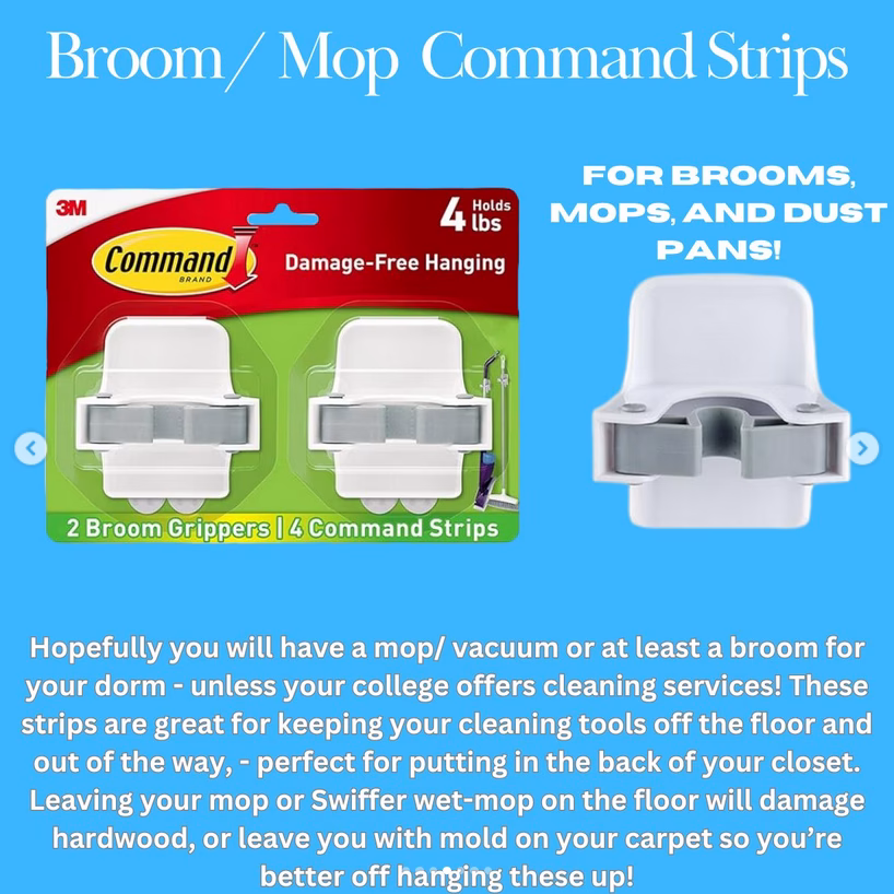 You’ll want something to clean your floors with, whether that’s a broom, mop, or Swiffer. The issue is that dorm floors get messy fast, and letting wet mops or cleaning tools sit on the ground is a quick way to ruin your flooring or end up with mold.